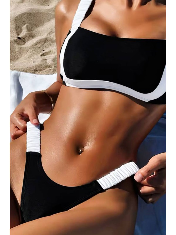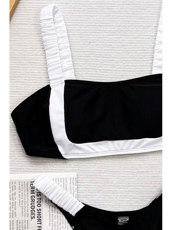 Черно-белый купальник с топом и чашками бразилиана на резинках
