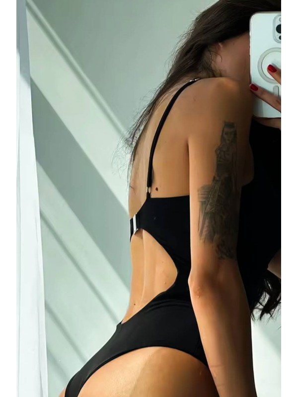 Черный женский купальник цельный украшенный пирсингом бразилиана