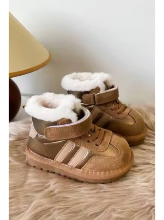 Дитячі завищені коричневі кросівки коричневі кеди на хутрі зимові, артикул КД-0109Модні дитячі кросі..