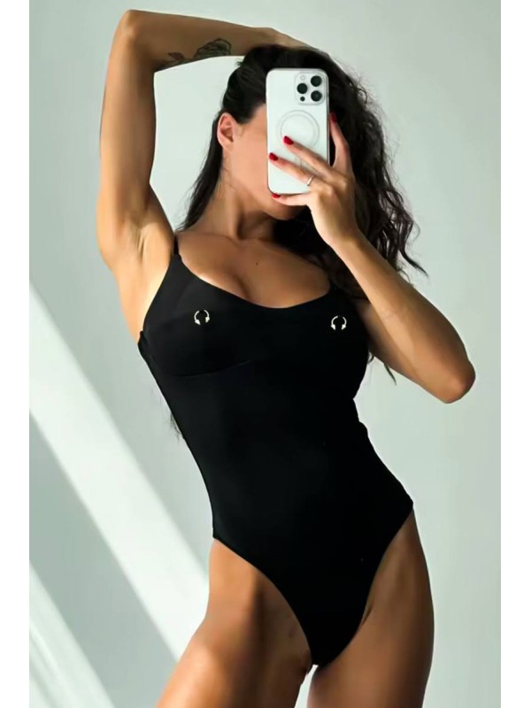 Черный женский купальник цельный украшенный пирсингом бразилиана