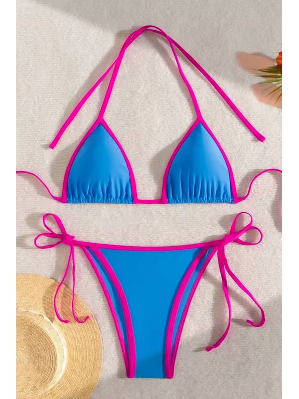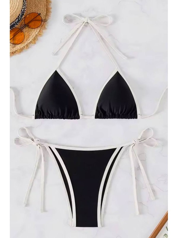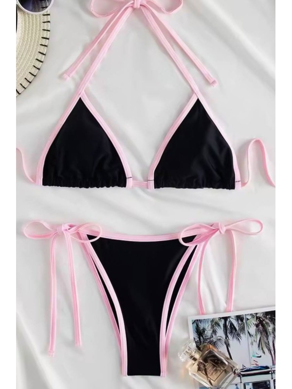 Женский черно-розовый купальник треугольник на завязках бразилиана