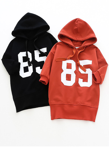 Стильне плаття для дівчинки з капюшоном від 1 до 5 років. Дана модель дуже зручна і універсальна. Купуючи її, Ви можете одягати як плаття або туніку. Зроблена з щільного котону. Є капюшон на шнурку, можна регулювати. На рукавах манжети. Зшита в модному чорному кольорі з білим малюнком, що дуже практично в повсякденному носінні. Прикрашено накаткой "номер 85". Сукня з номером, стане улюбленою річчю маленької модниці.