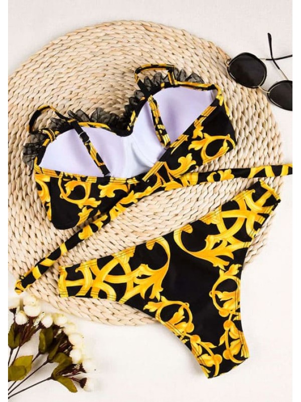 Сексуальний купальник з чашкою Анжеліка. Вгору з твердої чашкою, добре тримає форму. Є коригувальний пуш-ап. Трусики - бразільяна, відмінно підкреслять Вашу фігуру. Дана модель пошита в стильному чорному з золотими вензелями. Прикрашена мереживом з сітки.
