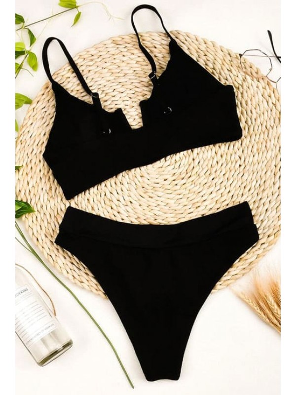 Чорний купальник високі бікіні + топ у рубчик
