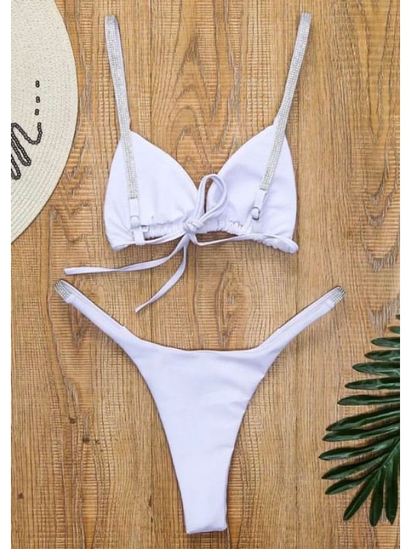 Жіночий блискучий купальник. Прикрашений стразами які шикарно переливаються на сонці.Виконано в стильному чорному, білому і рожевому кольорі. Бюст - трикутник зі знімними чашками. Трусики - бікіні. Дана модель купальника дуже зручна для максимального засмаги і відмінно підкреслить Вашу фігуру!