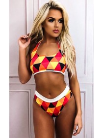 Різнобарвний, роздільний купальник з топом. Геометричний яскравий принт, підкорить модниць своєю неординарністю дизайну. Трусики з завищеною посадкою. Бюст - топ зі знімними чашками. Шикарно виглядає на засмаглому тілі!