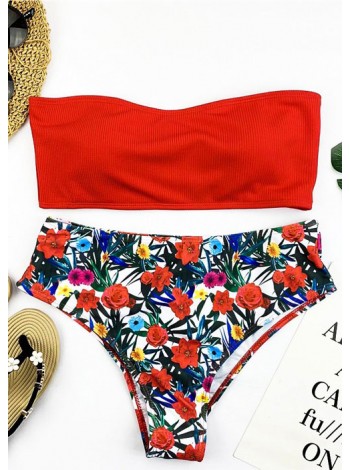 Червоний купальник бандо + бразилиана квітковим принтом