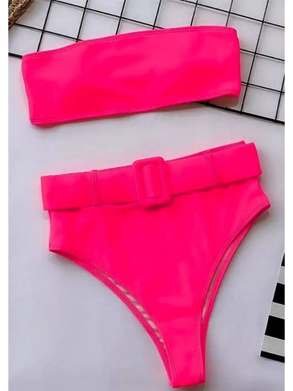 Рожевий яскравий неоновий купальник бандо з високими бразилиана