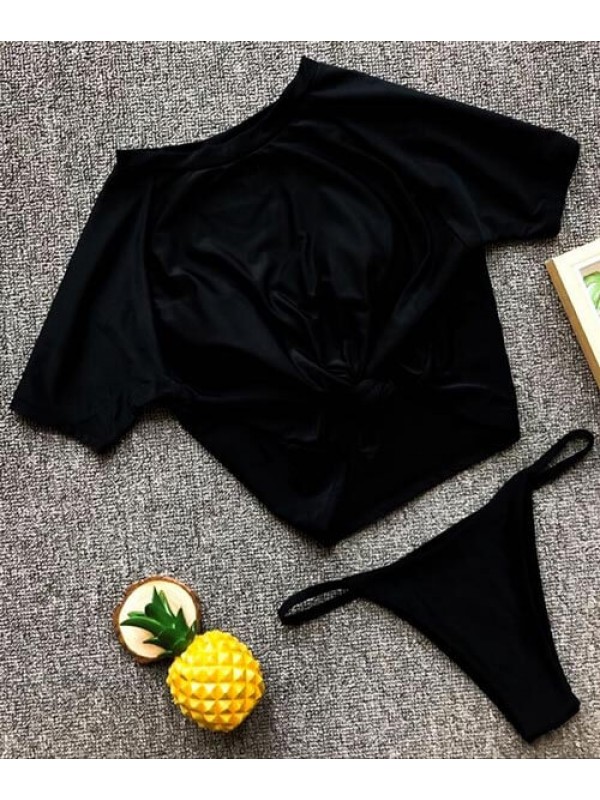 Стильний купальник з топиком. Трусики-бразільяна. Бюст-топ зі знімними чашками, спереду на зав'язці. Дану модель можна одягати під будь-який спортивний лук. Пошита в двох модних кольорах: зелений з листям і в чорному модному кольорі.