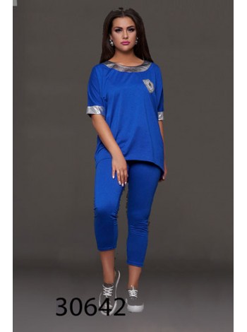 Стильний костюм для жінок з пишними формами. Модель синього кольору виконана з трикотажу двухнитки. Комплект складається з футболки з коротким рукавом трохи подовженої ззаду і облягаючих укорочених лосин з лампасами з боків. Кофта і штани декоровані срібними вставками.