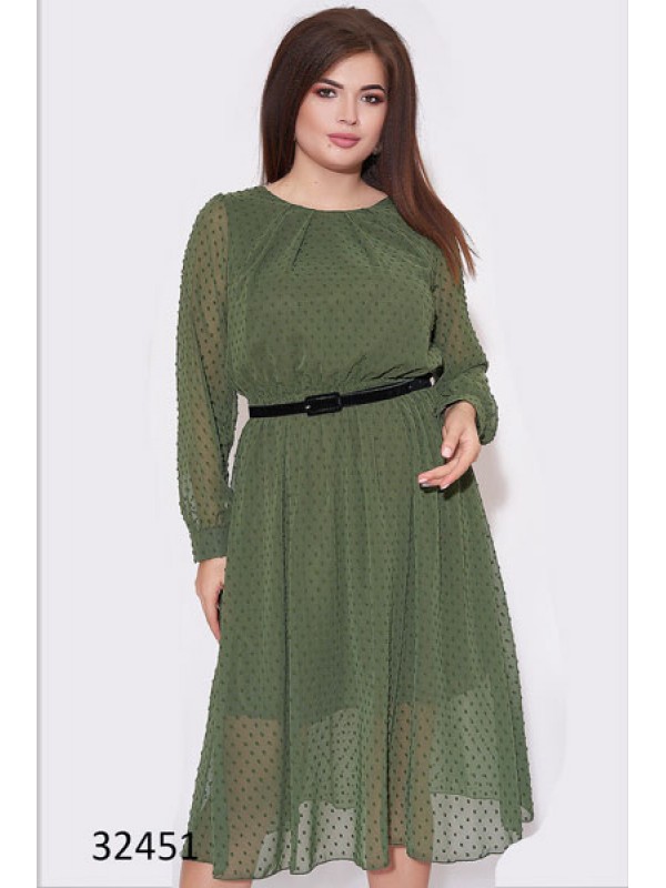 Красива вечірня сукня з шифону для жінок з пишними формами. Модель приталеного крою, із спідницею, що розкльошує. Довжина миди. Рукав довгий на манжеті. Горловина з круглим вирізом. Пояс в комплекті.