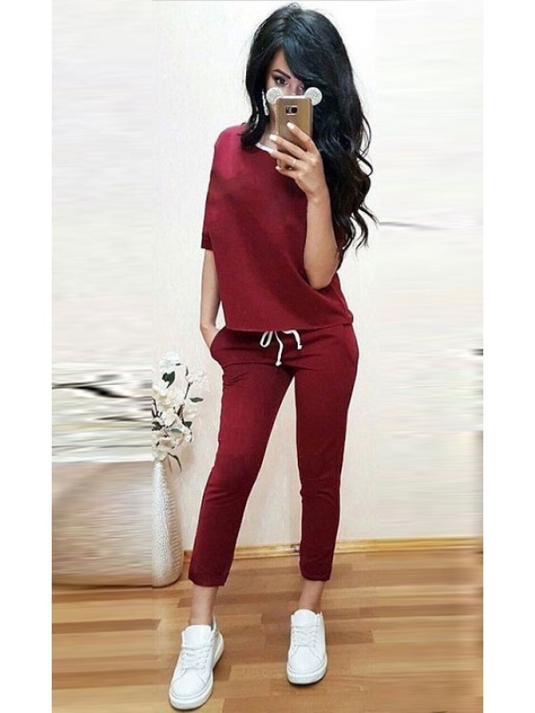 Літній трикотажний костюм в спортивному стилі. Комплект складається з футболки з коротким рукавом і укорочених штанів з підворотами. Горловина футболки оброблена білою бейкой. Повсякденний костюм виконаний з турецького трикотажу двухнитка. Трикотажний спортивний з брюками 7/8 підійде для літнього відпочинку, прогулянок або в якості домашнього одягу.