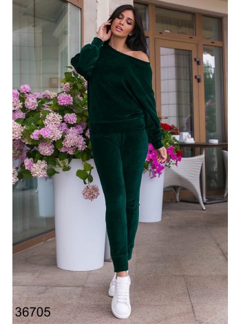 Модний велюровий костюм з кофтою на одно плечо. Спортивний костюм виконаний з якісного турецького велюру на бавовні. Костюм двійка виконаний в яскравих, красивих, сучасних забарвленнях. Комплект складається з кофти вільного крою з горловиною човник і спортивний облягаючих штанів з манжетами внизу. Спортивні брюки мають дві кишені. Спортивний костюм з велюру підійде для повсякденної шкарпетки, прогулянок або в якості домашнього одягу.