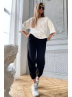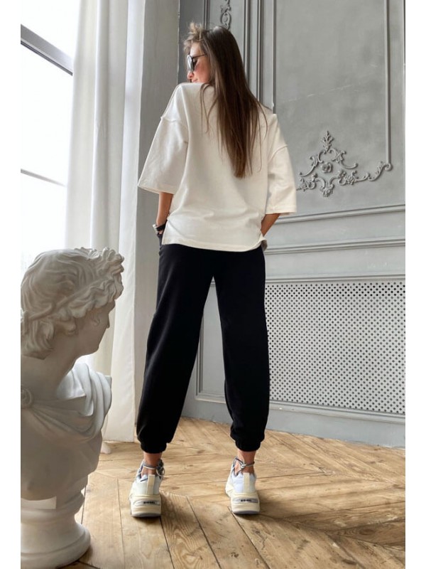 Модний жіночий спортивний костюм з трикотажу двухнитка. Комплект складається з кофти вільного крою з широким рукавом 3/4 і спортивних брюк. Штани чорного кольору, широкі, внизу на манжеті. З боків дві кишені. Вільний костюм в спортивному стилі зручний в якості повсякденного одягу.