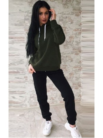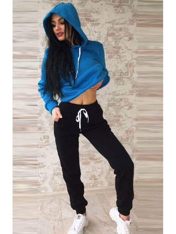 Спортивний костюм з трикотажу трехнитки з начісуванням - теплий і затишний. Комплект складається з кофти і штанів. Штани вільні, внизу на манжетах, чорного кольору в усіх комплектах. Толстовець з капюшоном Кишень немає.