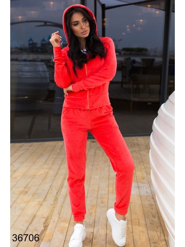 Модний спортивний костюм з якісного турецького велюру на бавовні. Костюм двійка виконаний в яскравих, красивих, сучасних забарвленнях. Комплект складається з кофти на блискавці з капюшоном і штанів внизу на манжетах. Спортивні брюки мають дві кишені. Пояс на гумці + шнурок. Велюровий спортивний костюм в такому виконанні підійде для повсякденної шкарпетки, прогулянок або в якості домашнього одягу.
