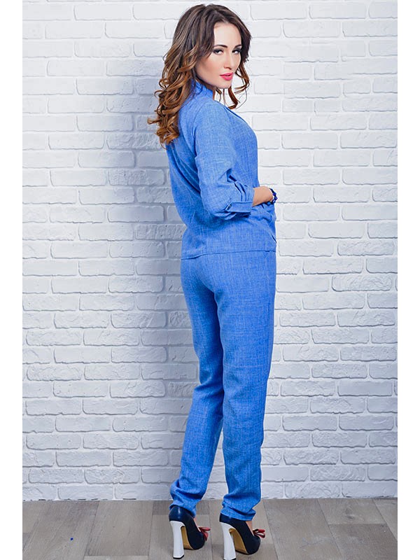 Літній лляний костюм Колізею складається з елегантного піджака і прямих вільних штанів. Піджак декорований накладними кишенями і красивою фурнітурою. Завдяки фасону костюм ідеальний для повних жінок і пропонується до р.60. Костюм прекрасне рішення для створення ділового річного стилю. Тканина легка. не мнеться, тримає форму.