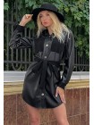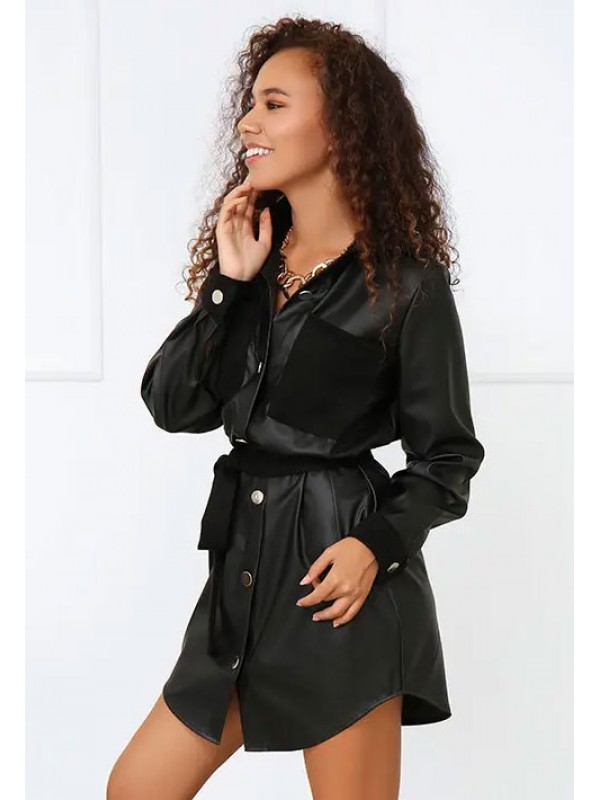 Стильне сукня-сорочка з якісної штучної шкіри від Woman - shop. Модель вільного, прямого крою, завдовжки вище за коліно, із закругленими розрізами з боків. Рукав довгий з манжетами. Комір відкладний. Сукня з эко-кожи на гудзиках доповнена накладними кишенями і поясом з эко-замши.