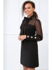 Нарядна, жіноча сукня трапецієвидного крою середньої довжини. Вечірня сукня з бантом, виконано з щільної костюмної тканини і ніжної сітки. Комір стойка, спереду зав'язується в шикарний бант. Рукав довгий з напівпрозорої сітки, внизу з широким манжетом, декорований великими гудзиками золотистого кольору.