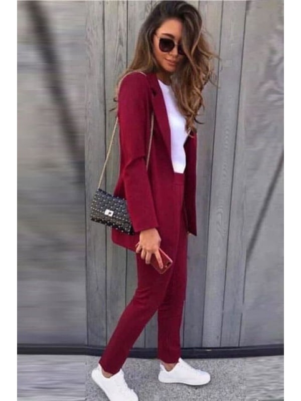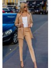 Класичний брючний костюм двійка. Комплект складається з брюк і піджака. Брюки завужені із зручною посадкою, застібаються на блискавку. Піджак без гудзиків і фурнітури, має модну довжину до середини стегна і кишені-обманки. Брючний костюм з вільним піджаком підійде для офісу, ділової зустрічі або в якості повсякденного одягу.