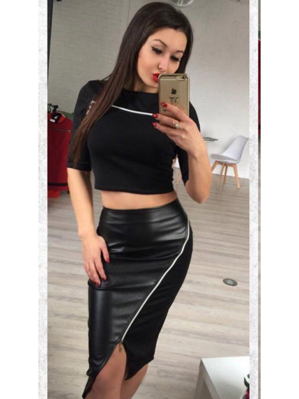 Стильний, молодіжний костюм-двійка " Марго", виконаний з трикотажу і екошкіри. Комплект складається з м'яко облягаючої спідниці і топа з коротким рукавом. Жіночна модель спідниці виконана на куточок. Спереду вставлена блискавка, за допомогою якої регулюється висота розрізу. На топі за допомогою змійки можна підкреслити красиве декольте.
