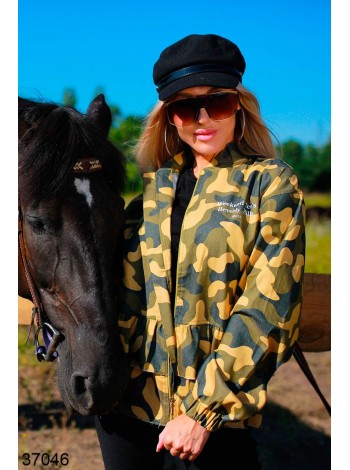 Модна жіноча куртка з малюнком камуфляжу. Модель прямого крою, застібається на блискавку. Рукав довгий, внизу на гумці. Комір стойка. По лінії талії широкий волан.