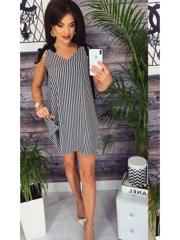 Легкий, коротенький сарафан, із зав'язками на плечах. Літній сарафан в смужку виконаний з легкої, повітряної тканини софтвер. Модель вільного крою - трапеція. Лінію грудей підкреслює V- образний виріз.