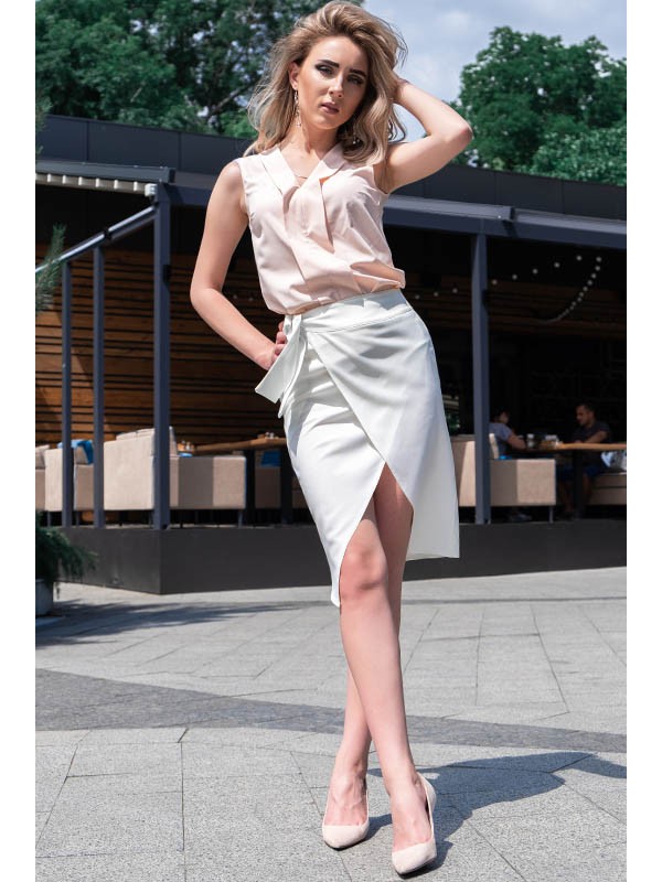 Красива річна спідниця оригінального фасону - на запах. Відмінне рішення на кожен день, в офіс, тому що легко поєднується як з блузкою, так і футболкою. Підходить практично для будь-якого типу фігури.