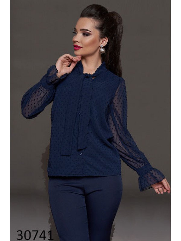 Стильна жіноча блуза довгим напівпрозорим рукавом з сітки з дрібний горошок. Модель вільного крою, застібається на гудзики. Комір стойка, що переходить в краватку, яку можна зав'язувати на бант. Підкладка тільки спереду, спинка напівпрозора. Ця блуза виглядає дуже стильно і елегантно.