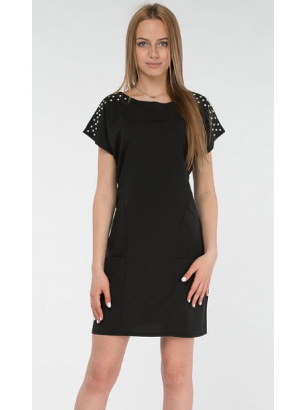Стильна літня сукня прямого силуету з кишенями з боків. Модель декорована вставками на плечах з термобусинами. Ззаду блискавка. Вільний крій і легка тканина дарує відчуття свободи і комфорту.