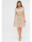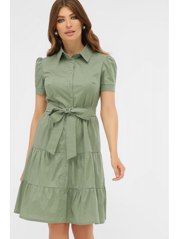 Ідеальний варіант сукні на кожен день або в офіс. Скромний елегантний дизайн в поєднанні зі спокійними пастельними відтінками в маленький горошок буде доречно в будь-якій ситуації. Спереду плаття прикрашає планка з невеликими ґудзиками, а по низу багатошарові волани. Талію підкреслює тканинний пояс, який йде в комплекті.
