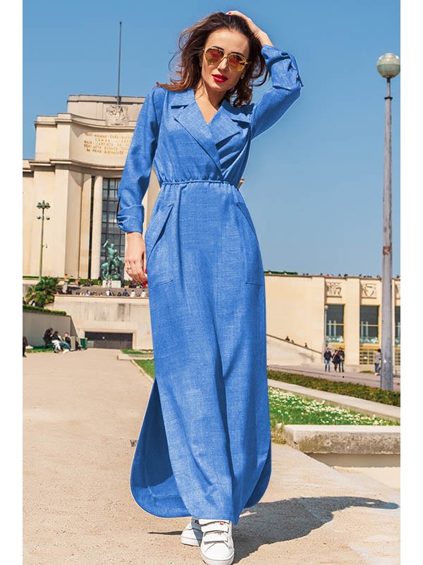 Стильне пряме плаття з регулюється рукавом. Довжина максі, а для комфорту під час ходьби два досить високих розрізу, які до того ж надають легкої сексуальності. Жіночний V - подібний виріз з відкладним коміром. На талії плаття прособірается на гумці, підкреслюючи талію. Цікаво виконаний рукав, драпірується за допомогою застібки з кнопкою. Загальний сучасний стиль доповнюють два накладних кишені.