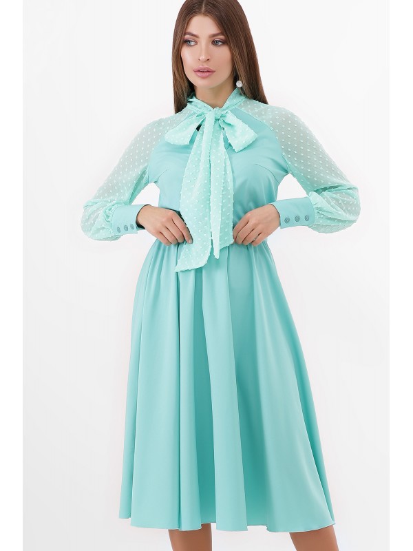Незвичайне поєднання гладкого софта з набивним шифоном, відразу привертає увагу жінок наступних за модою. Гарний широкий рукав на широкому манжеті, прекрасно виглядає з расклешенной спідницею. Футболка застібається спереду на гудзики. Декороване плаття шалевим коміром - бантом. У талії розташована гумка, що дозволяє підкреслити талію. Модель сукні дозволяє носити його на роботу, побачення, ділову зустріч, прогулянку.