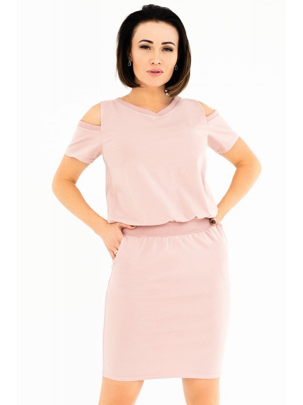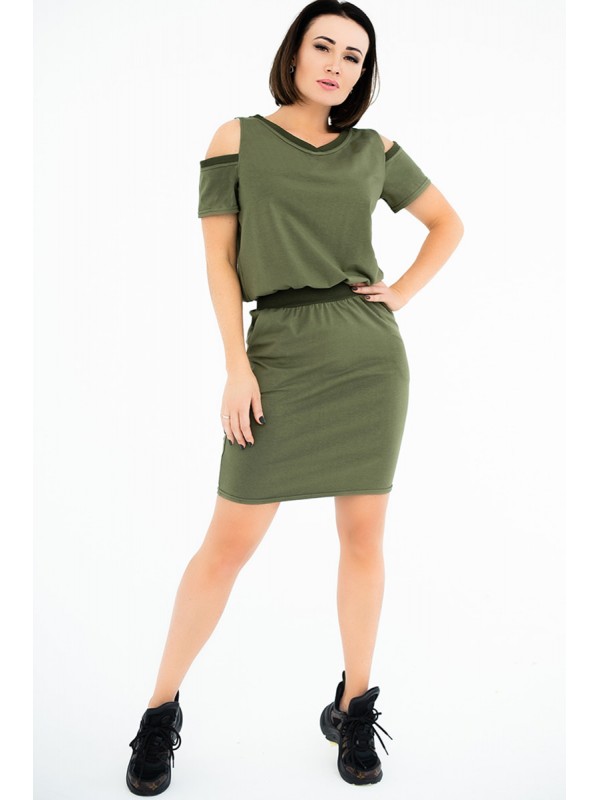 Стильне молодіжне плаття, прекрасний одяг для прогулянок, поїздок, зустрічей з друзями. Не тільки зручна, але і дуже сексуальна модель. Завдяки довжині міні і пікантно оголенніми плечах. Оригінальнім декором служать вставки з трикотажної гумки на пару тонів темніше.