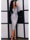 Woman-shop пропонує купити красиву вечірню сукню з люрексу срібного кольору. Елегантна сукня із запахом завдовжки миди.  Лінію талії підкреслює пояс.  Рукав довгий. Модель поєднує в собі класичний силует, дизайнерський крій і розкішну тканину.  Блестящее платье с V-вырезом подойдет для любого торжественного мероприятия.