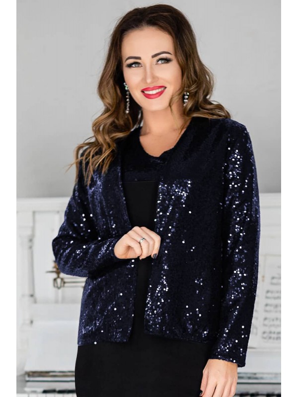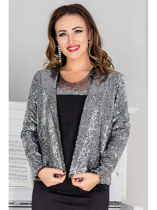 Гарний ошатний піджак з паєтками дозволяє в лічені хвилини надати повсякденного цибулі яскравості. Блискучий піджак з тканини з дрібної паєтками чудово виглядає в ресторані, кафе, вечірньому клубі. Вільний короткий піджак без застібки можна накинути на пряме плаття, або доповнити комплект з брюками. Для комфорту модель виконана з шовковою підкладкою.